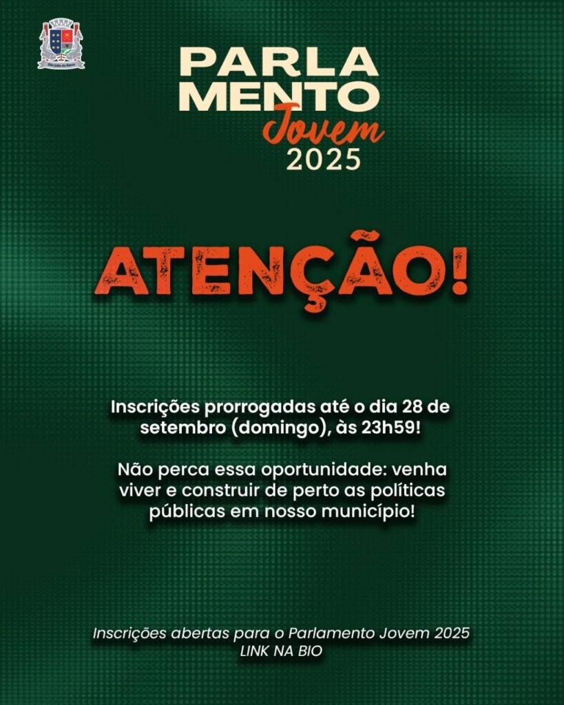 A Câmara de São João da Barra prorrogou até o próximo domingo (28), as inscrições para o Parlamento Jovem 2025. Os estudantes interessados em participar devem se inscrever pelo Instagram do Legislativo (@camaradesaojoaodabarra), no formulário digital que está na bio onde também consta o edital com todas as informações. Podem participar, gratuitamente, alunos do 6º ao 9º ano do ensino fundamental, entre 10 e 16 anos, de escolas públicas e particulares do município.